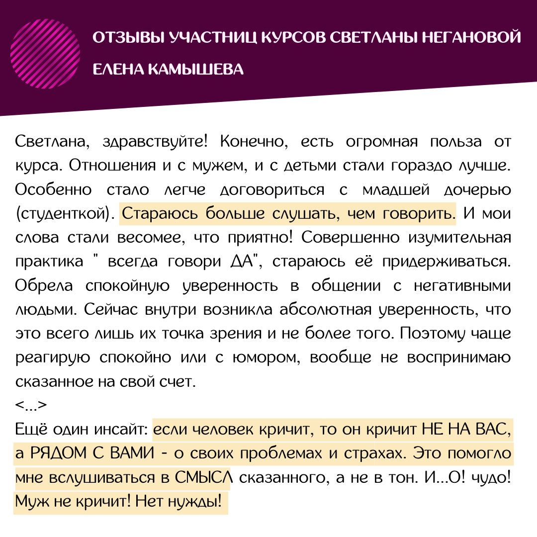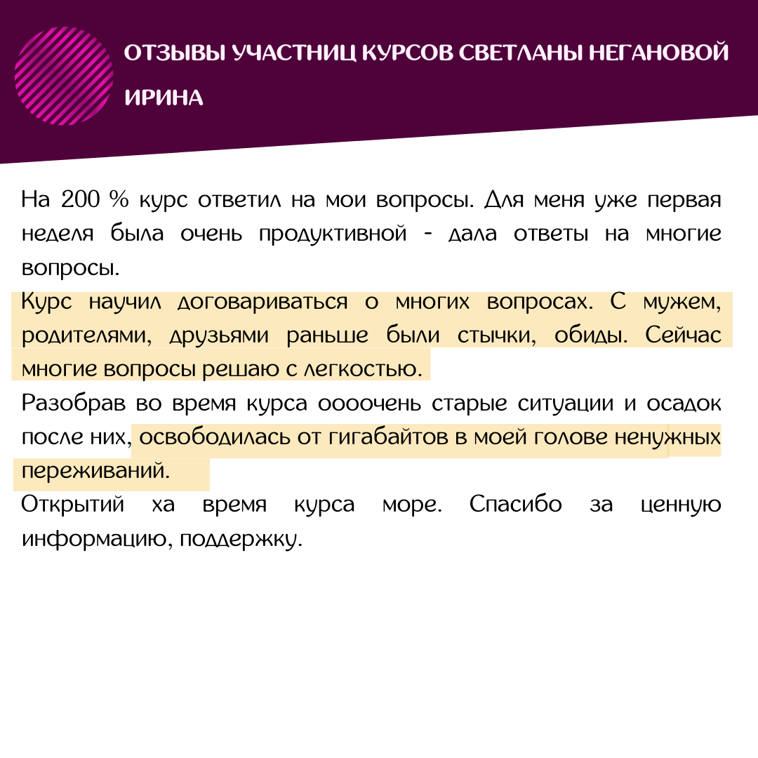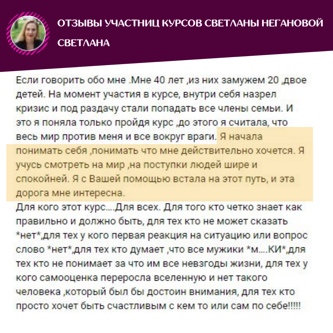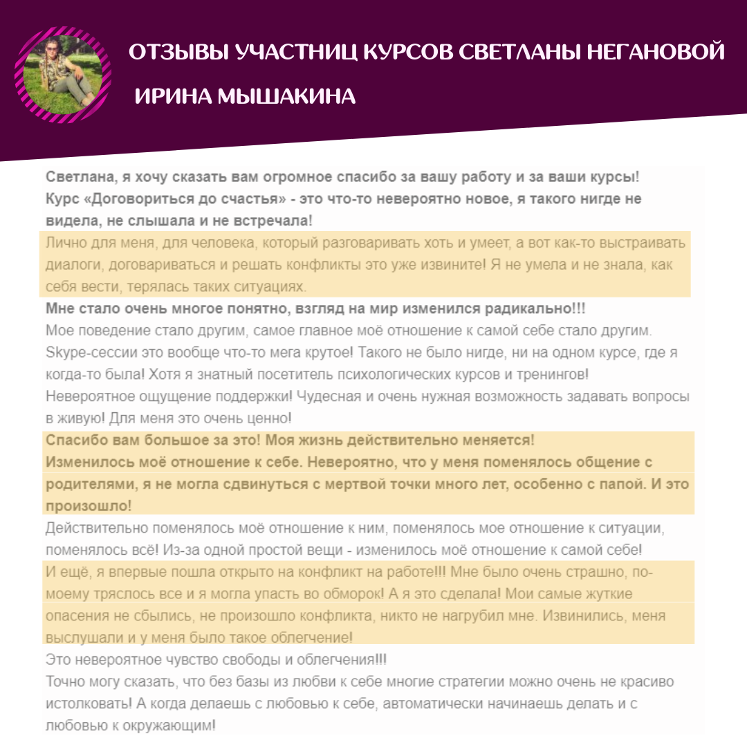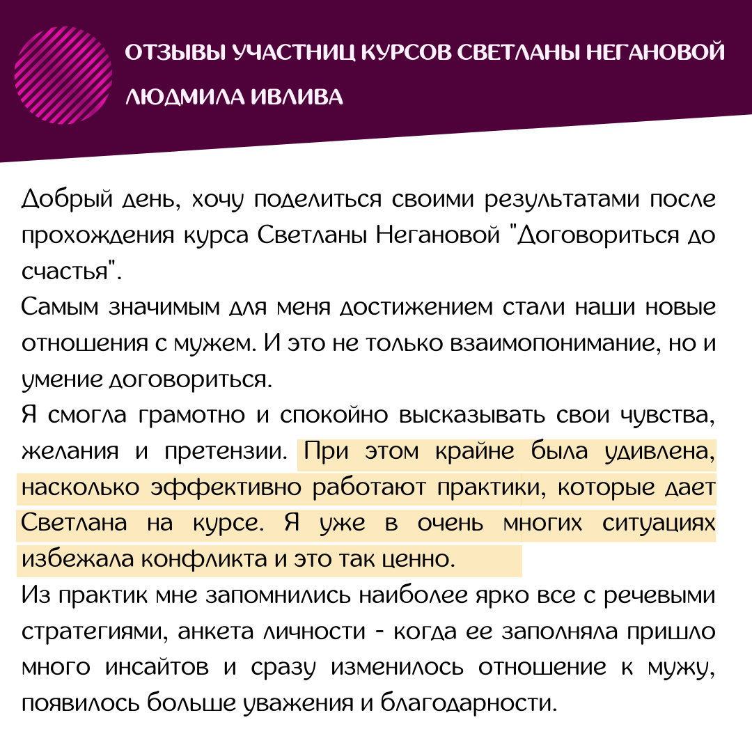 Все эти знания + практический опыт в управлении персоналом (более 12 лет) помогли мне научиться жить в гармонии с собой и в ладу с другими. Построить крепкие отношения с любимым мужем.