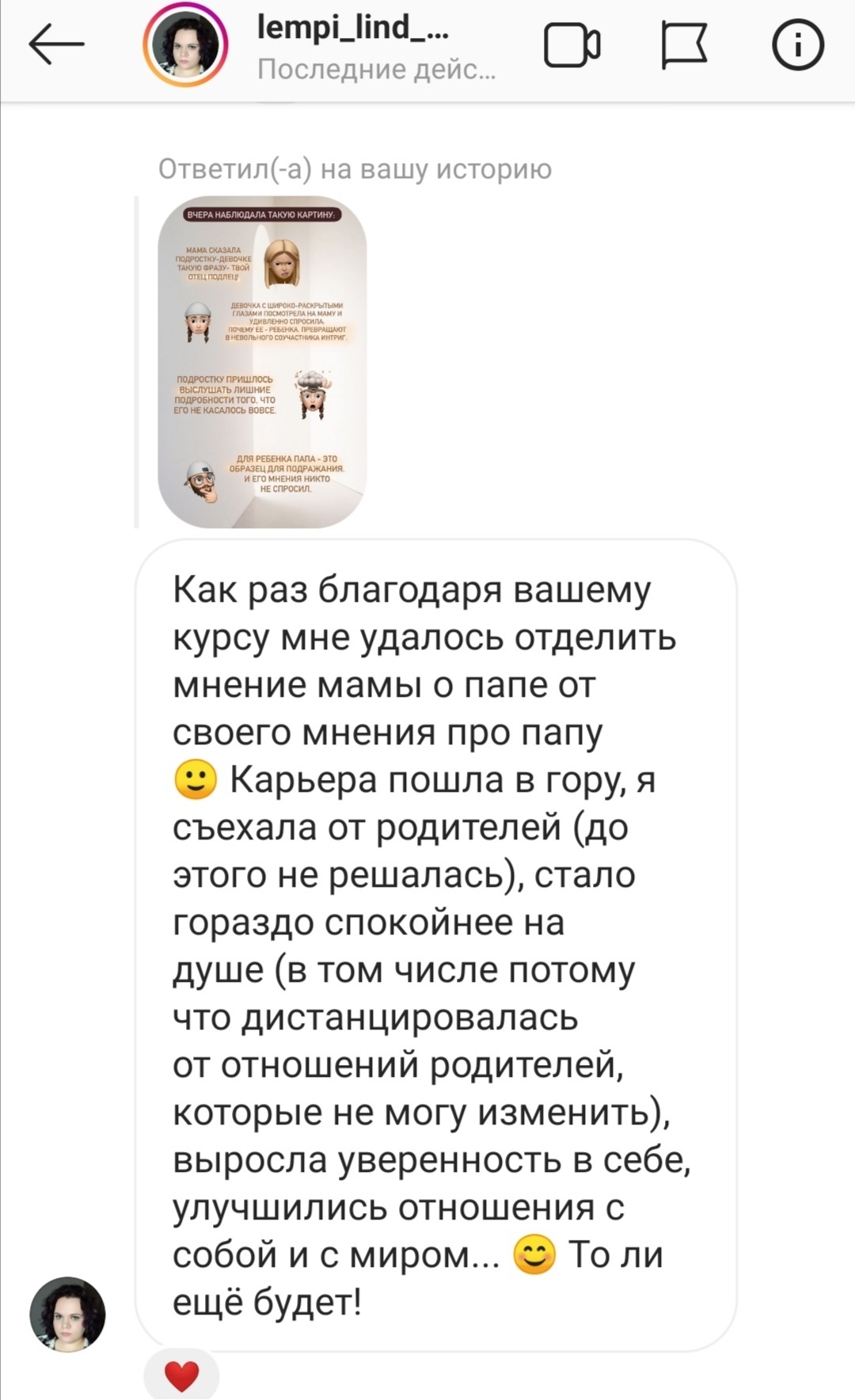 "Благодаря грамотно поставленным целям, выполнению заданий курса и поддержке куратора НАЛАДИЛА ОТНОШЕНИЯ С МАМОЙ, ощутила себя взрослой и уверенной, с легкостью прошла собеседование и нашла работу..."